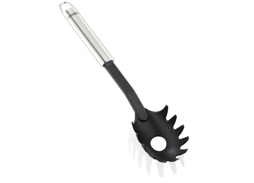 Elegant design van hoogwaardig rvs. De matglanzende handgrepen van de keukenhulpjes uit de serie Sterling van Leifheit doen denken aan tijdloos zilver, met de daaraan verbonden allure en lange levensduur. Perfect geschikt voor gebruik aan tafel en bovendien erg handig. De bak van deze lepel ? een lepel bestaat uit een steel en een bak ? is van hittebestendig nylon (tot 160° C) en beschermt de kwetsbare antiaanbaklaag van je pannen. De ovale handgreep van spaghettilepel Sterling ligt prettig in de hand en zorgt voor een goede grip. Aangenaam stabiel dankzij het hoogwaardige roestvrij staal. Met handig ophangoog. Geschikt voor de afzonderlijk verkrijgbare Sterling ophangrail.