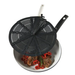 Een innovatief antispatdeksel voor je koekenpan. Dichtgevouwen net zo groot als een taartschep. Het opvouwbare antispatdeksel van Leifheit is gemaakt van kunststof en daardoor erg licht. Het kan als een waaier opengevouwen worden en past dichtgevouwen in iedere keukenla. Je kunt het deksel meer of minder open- of dichtschuiven, tot iedere gewenste positie, zodat je goed in de gaten kunt houden wat er in de pan gebeurt. Het deksel kan dus op de pan blijven liggen, er komt geen vet of vocht op je fornuis of aanrecht. Damp kan ontwijken door de stoomgaten in het deksel. Het vastzetmechanisme voorkomt ongewenst open of dichtvouwen. Met ophangoog.