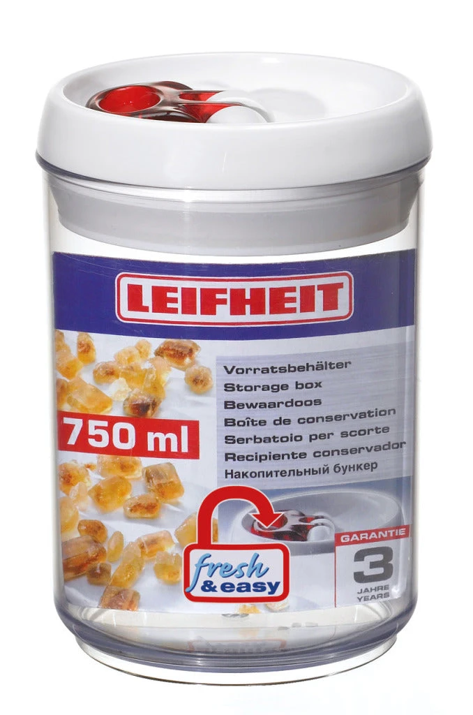 Openen en luchtdicht sluiten met één hand, dat kan met de handige bewaardozen Fresh & Easy van Leifheit. Je herkent ze aan hun elegant design en aan de rode ring van de gepatenteerde eenhandsbediening. Openen: de ring omhoog klappen. Sluiten: deksel erop leggen, ring neerklappen en alles is lucht- en waterdicht afgesloten. De ronde Fresh & Easy voorraaddozen kun je heel gemakkelijk op elkaar stapelen. Zo bespaar je ruimte in de keuken en voorraadkast. En opgeruimd staat netjes! Inhoud 750 ml. Deze fraaie bewaardozen zijn ook in zes andere maten verkrijgbaar: 400 ml, 900 ml, 1,1 liter, 1,4 liter, 1,7 liter en 2 liter.