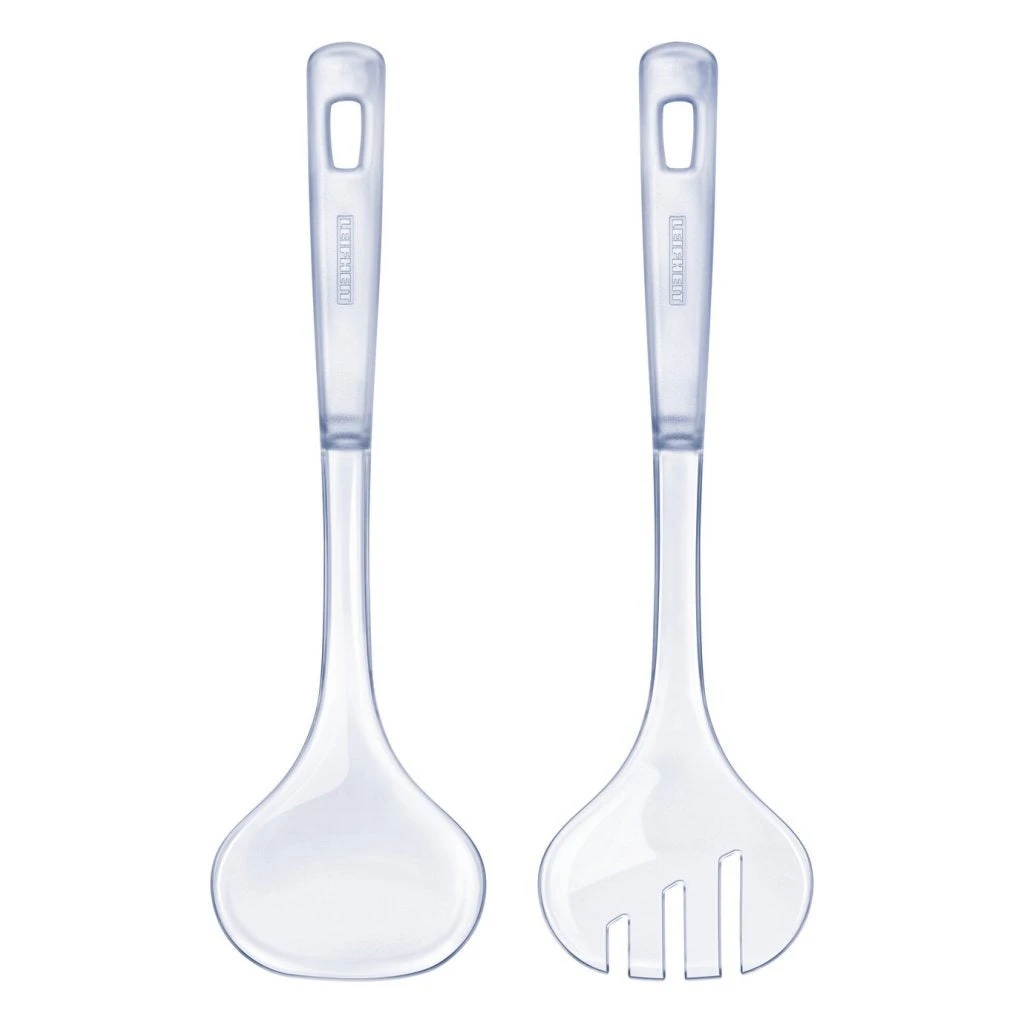 Een heerlijke salade, een mooi gedekte eettafel, en dan… zakt het slabestek weg in de kom. Leifheit heeft de oplossing. Het slabestek van Leifheit is gemaakt van glashelder kunststof en heeft twee handige haakjes, waarmee het bestek netjes aan de rand van de slakom blijft hangen. Het geheim: direct onder de handgreep zitten decente haakjes. Dat maakt altijd netjes en stijlvol serveren mogelijk, ook bij een salade in een hoge kom. Het design is bijzonder aantrekkelijk. De moderne transparante look past perfect bij iedere slakom en is ideaal voor gebruik aan tafel. Bovendien is de stevig en ergonomisch vervaardigde kunststof ook geschikt voor dagelijks gebruik. Beide delen zijn voorzien van een ophangoog en kunnen plaatsbesparend aan een ophangrail worden opgeborgen. Van vaatwasserbestendig materiaal.
