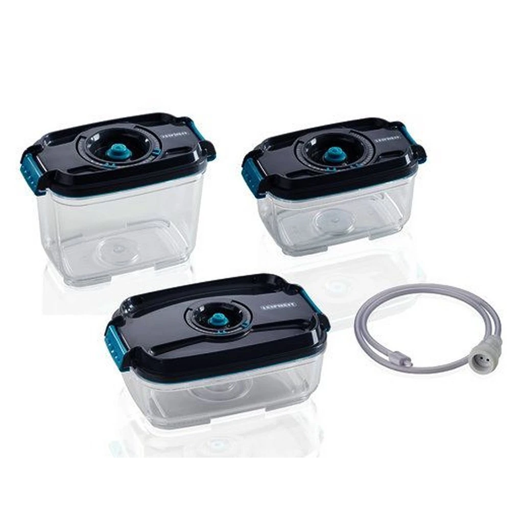 Door een lucht- en waterdichte afsluiting blijven vlees, vis, groenten of fruit langer vers en aromatisch.Met behulp van de slang die al in de set zit, kunnen de dozen in slechts enkele seconden elektrisch worden vacuüm gezogen.De blikken zijn geschikt voor alle Leifheit-vacuümapparaten en zijn bijzonder geschikt voor drukgevoelige, vloeibare of zeer vochtige voedingsmiddelen.Om de inhoud langer te bewaren, kunnen de vacuüm dozenn natuurlijk ook worden ingevroren.De inhoud is goed beschermd tegen vriesbrand en de smaak en voedingsstoffen van het voedsel blijven behouden.De dozen zijn geschikt voor de magnetron en kunnen daardoor gemakkelijk worden ontdooid of verwarmd.Bij gebruik in de magnetron dient het deksel te worden verwijderd, deze is eenvoudig te openen via een geïntegreerd ventiel.Het is ook praktisch dat de vacuüm dozen vaatwasmachinebestendig zijn en daardoor gemakkelijk schoon te maken.Daarnaast kunnen de dozen ruimtebesparend opgeborgen worden omdat ze op elkaar gestapeld kunnen worden.Voor een betere organisatie en controle zit er een datumaanduiding in het deksel zodat je altijd precies weet wanneer je welk voedsel hebt verpakt.De set bestaat uit drie BPA-vrijevacuüm-vershouddoosjes voor levensmiddelen in de maten 500 ml, 800 ml en 1400 ml en een slang met adapter die geschikt is voor alle Leifheit-vacuümapparaten.