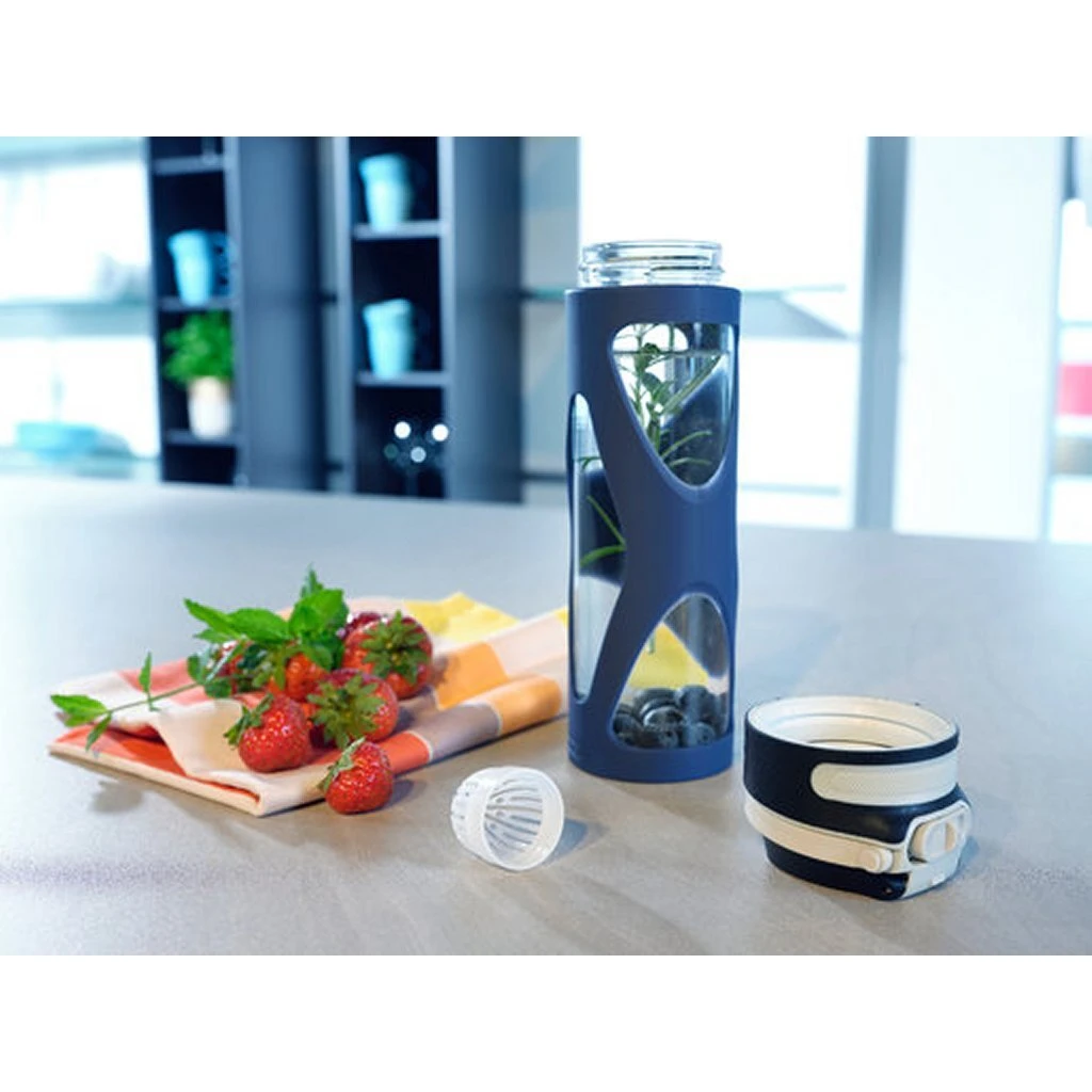 Drink overal comfortabel – zelfs als slechts één hand vrij is. Niet alleen gemakkelijk te gebruiken, maar ook 100% lekvrij.Doordat het deksel met schroefdop goed sluitkan deze niet per ongeluk worden geopend.Hierdoor kan de drinkfles veilig in je zak worden meegenomen.Bijzonder praktisch is ook de uitklapbare handgreep, die comfortabel dragen mogelijk maakt.De drinkfles is ook ideaal voor kinderen of om te sporten.Dankzij het handvat kan hij ook aan rugzakken of boekentassen worden bevestigd.Omdat de fles vrij is van BPA en andere schadelijke stoffen en bestaat uit hittebestendig glas, kan hij gevuld worden met koude en warme dranken tot 65 °C.Dankzij het schroefbare filter in het deksel kunnen fruit of kruiden worden toegevoegd zonder het drinken te storen.De siliconencoating van de fles beschermt tegen hitte en glasbreuk.Hierdoor is hij ook gemakkelijk vast te houden.Er is ook een softgrip-oppervlak op het deksel om het openen van de fles gemakkelijker te maken.