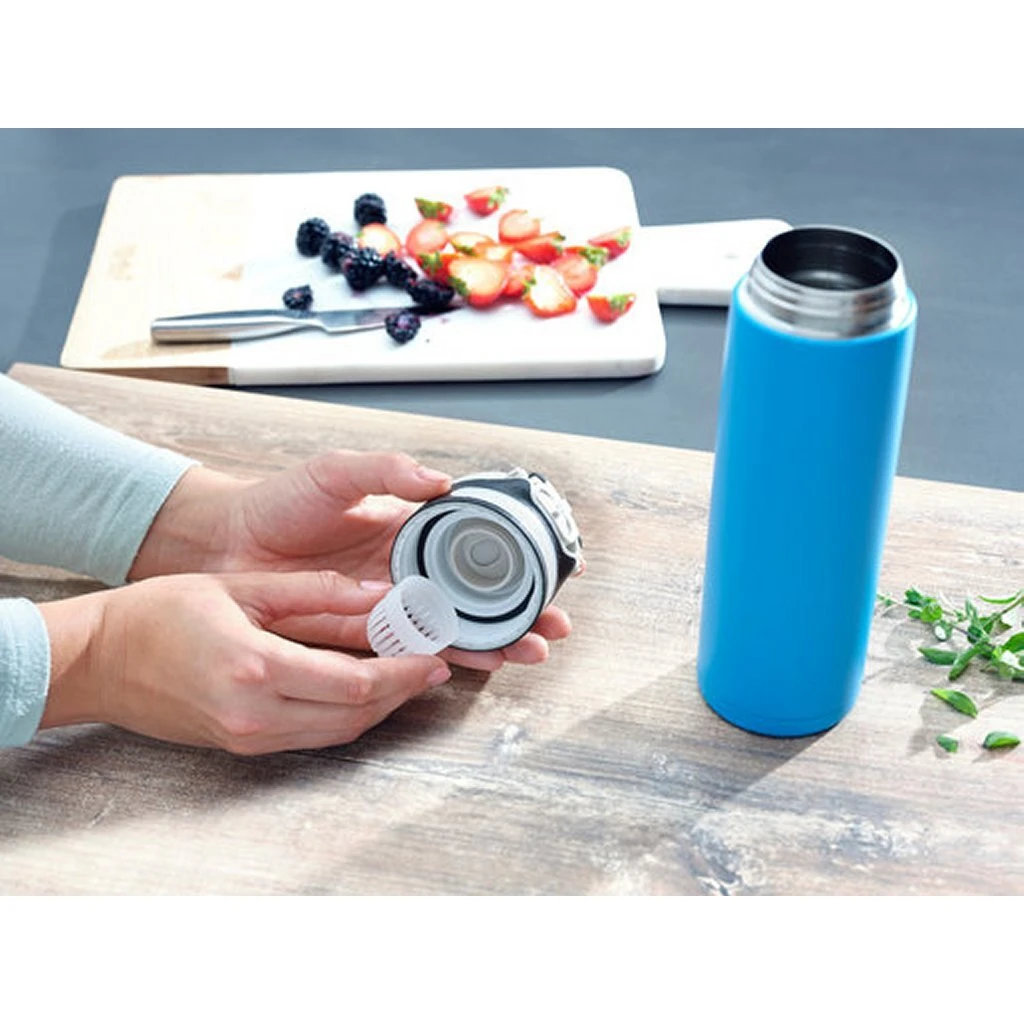 Als je op zoek bent naar een lekvrije thermobeker die je veilig in je zak kunt meenemen, dan is de Flip isoleerbeker van Leifheit de juiste keuze.Omdat deze verschillende veiligheidsfuncties heeft die voorkomen dat de inhoud lekt: het deksel is voorzien van een sluiting die 100% lekvrij is.Het slot voorkomt dat het deksel van de isolerende beker vanzelf opengaat.Hij kan dus gemakkelijk overal mee naartoe worden genomen.De drukknop is ook bijzonder praktisch voor onderweg.Hierdoor is het mogelijk om de beker met één hand te openen – en zonder hem neer te hoeven leggen.Het filterelement in het deksel voorkomt dat kruiden, fruit en dergelijke het drinken verstoren.Het filter kan van het deksel worden losgeschroefd en gemakkelijk grondig worden gereinigd.Uiteraard is de beker niet alleen geschikt voor koffie-to-go en andere warme dranken, maar ook voor coole dingen.Dankzij de dubbelwandige isolatie van roestvrij staal houdt het koude dranken tot 18 uur aangenaam koel en warme dranken tot6 uur warm.