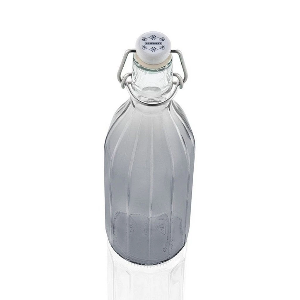 Dat ziet er goed uit op je eettafel of tuintafel, op het dressoir, in een open kast of vitrinekast. Met hun elegante design brengen de Leifheit facetflessen sfeer in huis en tuin. Dat voelt goed! Een fles die perfect past bij legio stijlen, net zo goed bij vintage en retro als bij landhuisstijl. De beugelsluiting van roestvrij edelstaal sluit de fles luchtdicht af, zodat de inhoud lang vers blijft. De facetfles met 0,5 liter inhoud is ideaal voor alles wat je decoratief wilt bewaren. Of maak er een stijlvol cadeautje van! Leuk met vers geperst sap of zelfgemaakte likeur. Of doe er met een paar kruidentakjes, knoflook of chilipepers gearomatiseerde olie in. Ideaal voor zelfgemaakte siroop ? alles wat heet in de fles gevuld wordt. Maar je kunt er ook lekker koel kraanwater stijlvol in serveren. De facetflessen zijn het schone alternatief voor kunststof flessen, want de glazen flessen van Leifheit bevatten geen schadelijke stoffen. Met hun subtiele kleurverloop ook heel geschikt voor creatieve knutselprojecten. Of gebruik ze als bloemenvaas, de elegante zachtgrijze kleur staat mooi op tafel. De facetfles bestaat uit hittebestendig glas en kan gevuld worden met hete vloeistof tot 100°C. De fles heeft een roestvrijstalen beugelsluiting en kan in de vaatwasser. BPA-vrij.