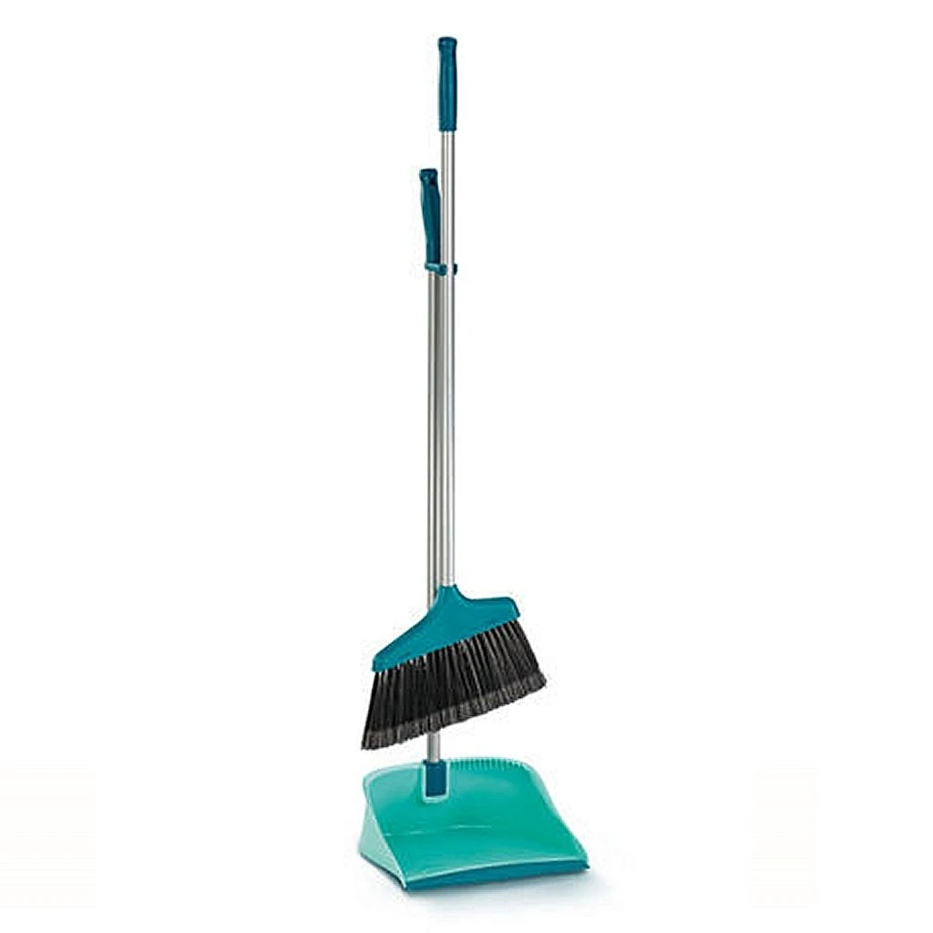 Het stoffer en blik met lange steel en open blik van Leifheit is ideaal voor het vegen zonder te bukken. De bezem veegt bijzonder grondig dankzij de fijne borstelharen en de vorm die is aangepast aan de veeghoek. Hiertoe dient ook de asymmetrische vorm van de bezem. Deze is aan de veeghouding aangepast, zodat alle borstels ook bij een schuin gehouden steel volledig op de ondergrond liggen. Een ander voordeel is het blik met de extra lange rubberen lip, die het opvegen op oneffen ondergronden vereenvoudigd. Voor het ruimtebesparend opbergen wordt de bezem aan de bliksteel bevestigd en wordt het blik ingeklapt. Met schraapkant voor het reinigen van de bezem.