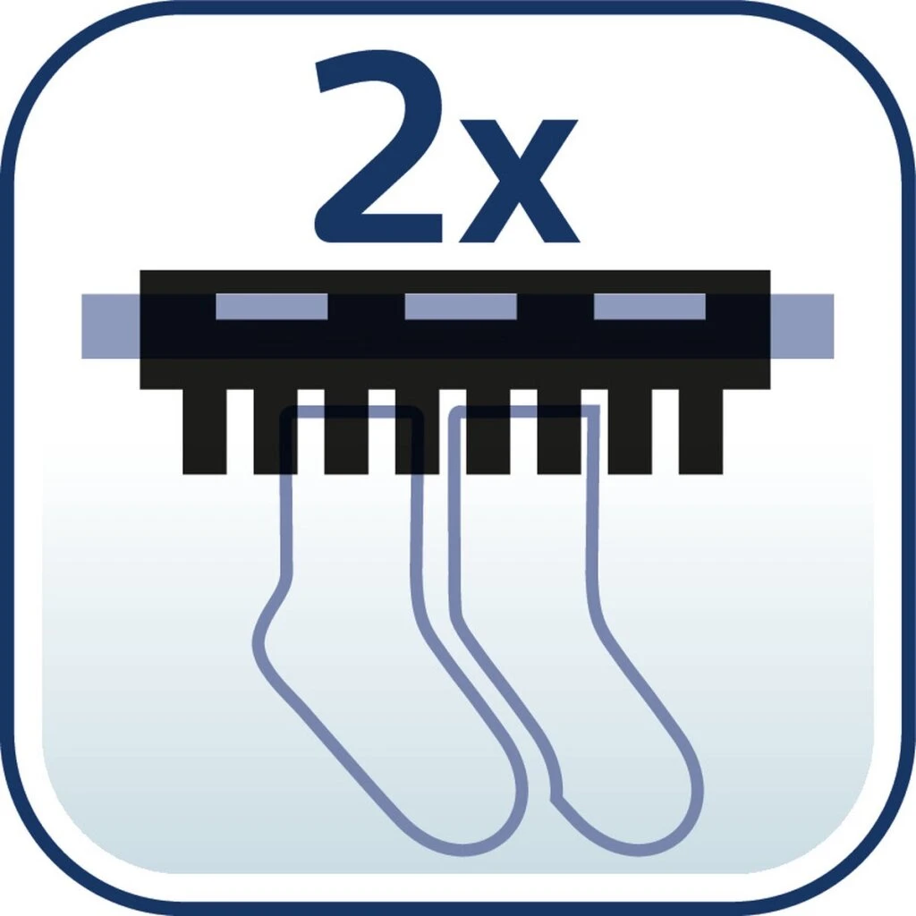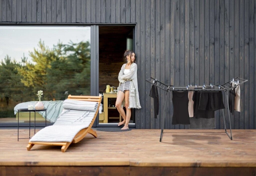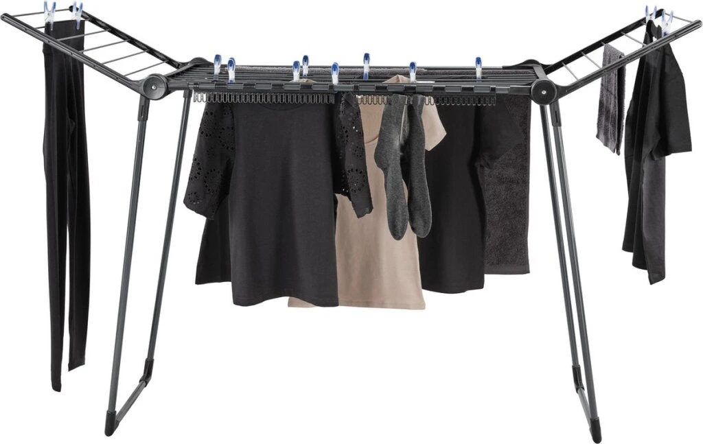 Staand droogrek Pegasus 150 Solid Slim black is bijzonder praktisch en biedt veel gebruiksgemak. Met zijn uitklapbare vleugels biedt dit droogrek veel ruimte voor grote en kleine stukken wasgoed. Bovendien kun je aan de houder voor klein wasgoed snel en plaatsbesparend sokken en andere kleine spullen ophangen. Slechts 55 cm smal, past dus ook uitgeklapt door keuken- of balkondeur. Dat is wel zo praktisch bij een plotselinge regenbui. Dankzij de antislipvoetjes staat het droogrek windvast en stabiel op het balkon, in de tuin of op gladde vloeren binnenshuis. Dit droogrek met vleugels heeft een totale drooglengte van 15 meter. Je kunt dus bijna twee wasmachineladingen tegelijk drogen.De vleugels met een hoogte van 1,05 meter zijn ook geschikt voor lange stukken wasgoed. Bovendien krijg je bij de Pegasus 150 Solid Slim twee houders voor klein wasgoed die je op de zijkant van het droogrek kunt bevestigen. Daaraan hang je zonder wasknijpers snel en simpel sokken, zakdoekjes of slipjes op. Gewoon vastklemmen en klaar. Na gebruik kan het droogrek compact ingeklapt en plaatsbesparend opgeborgen worden. Volledig roestvrij.