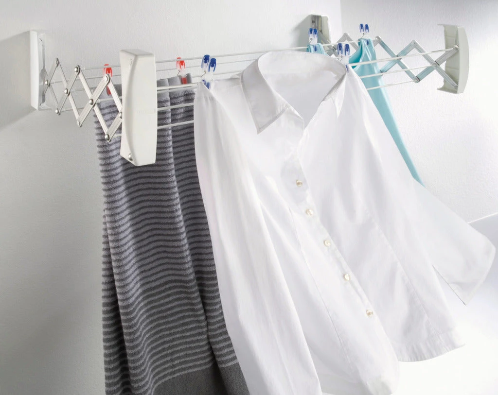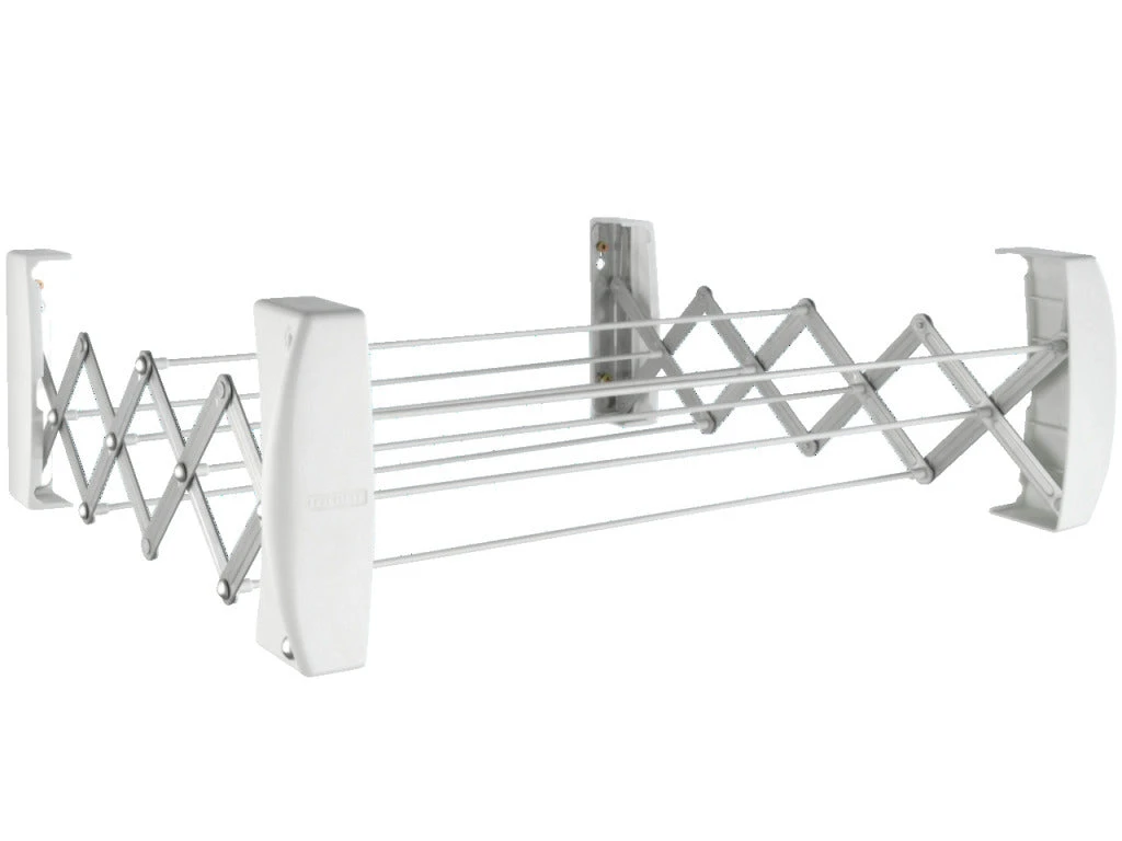 Droogrek Teleclip 42 Extendable is slechts 60 cm breed en past daardoor perfect boven de wasmachine of andere huishoudelijke apparaten, boven het bad en zelfs in de douche. Droogrek Teleclip 42 Extendable is uittrekbaar zoals een trekharmonica. Dankzij de verspringende droogstangen biedt dit compacte droogrek toch een drooglengte van maar liefst 4,20 meter. De Teleclip 42 Extendable is een perfect wanddroogrek voor kleine wasjes of voor een eenpersoonshuishouden. Eenvoudige montage, dit robuuste wanddroogrek is snel opgehangen. Met de handgrepen aan de zijkanten snel en gemakkelijk uit te trekken.