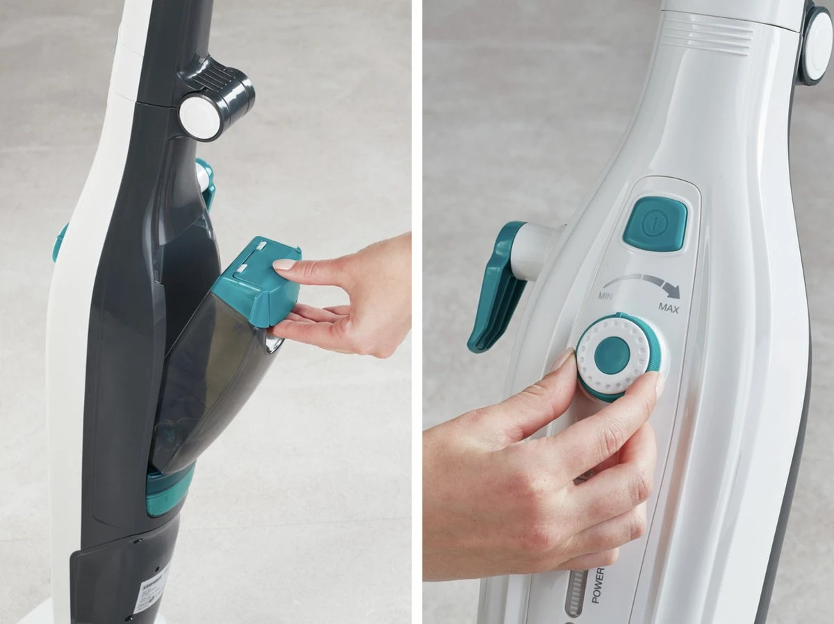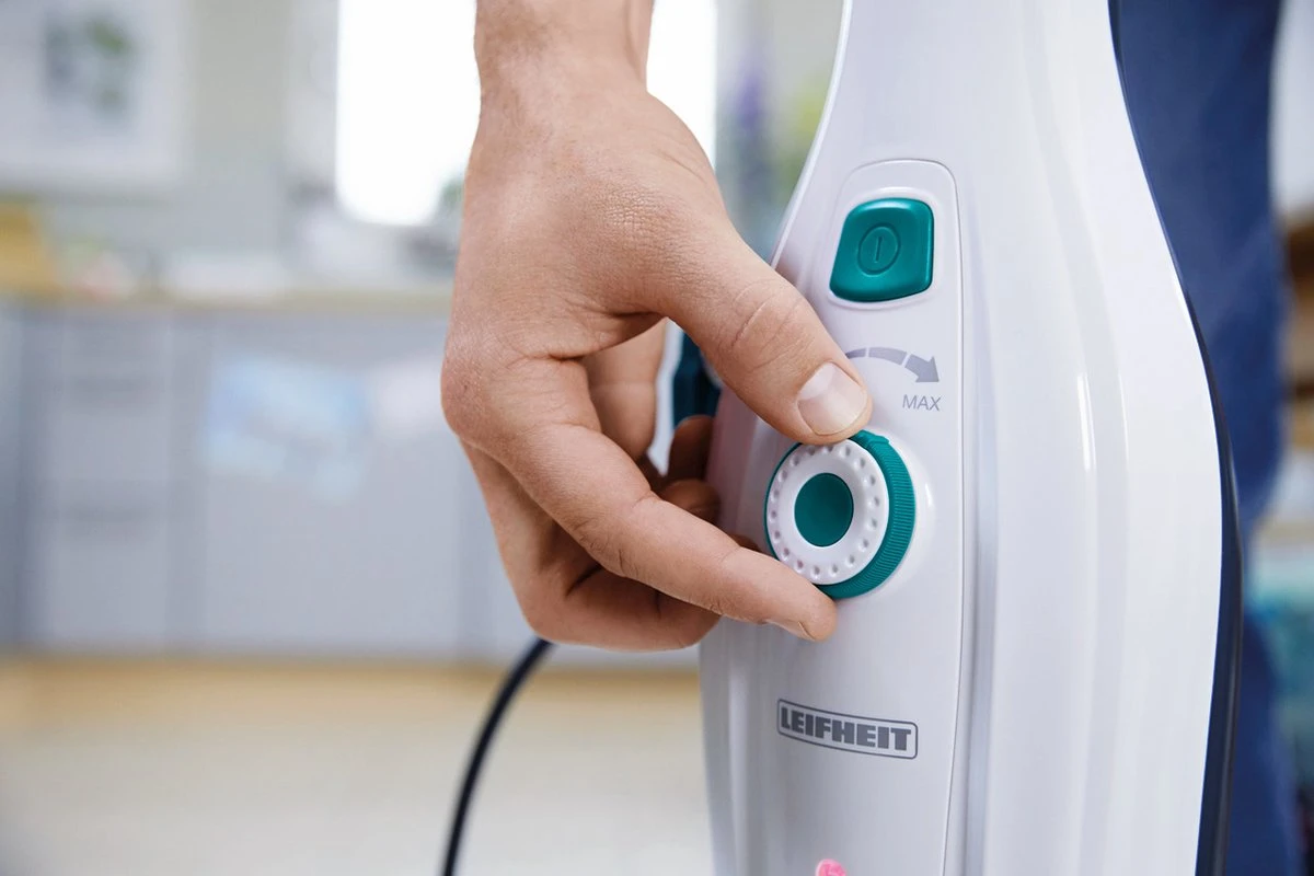 En zo eenvoudig werkt het: de stoomreiniger heeft minder dan 30 seconden nodig om op te warmen en is dan al meteen klaar voor gebruik. Als het water heet is, wordt de stoom door zes stoomopeningen gelijkmatig in de vloerwisser verdeeld. Met de traploze regelknop kun je de hoeveelheid stoom optimaal op de vloer afstemmen. De laagste stand is geschikt voor gelakte houten vloeren zoals parket en laminaat. De hoogste stand is voor grondig reinigen van stenen vloeren en tegelvloeren. De verwisselbare microvezel vloerwisser neemt het losgeweekte vuil op, zodat alles hygiënisch en grondig schoon wordt. Met de praktische tapijtglijder is de stoomreiniger ook geschikt voor het opfrissen van tapijt.