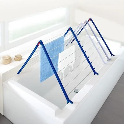 Dit praktische Leifheit droogrek Pegasus Bath 190 kan in de vorm van een omgekeerde V over de badkuip geplaatst worden.