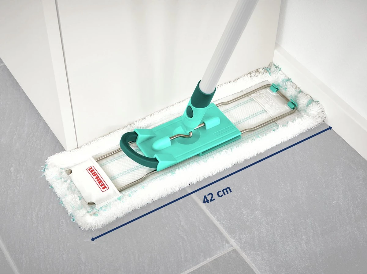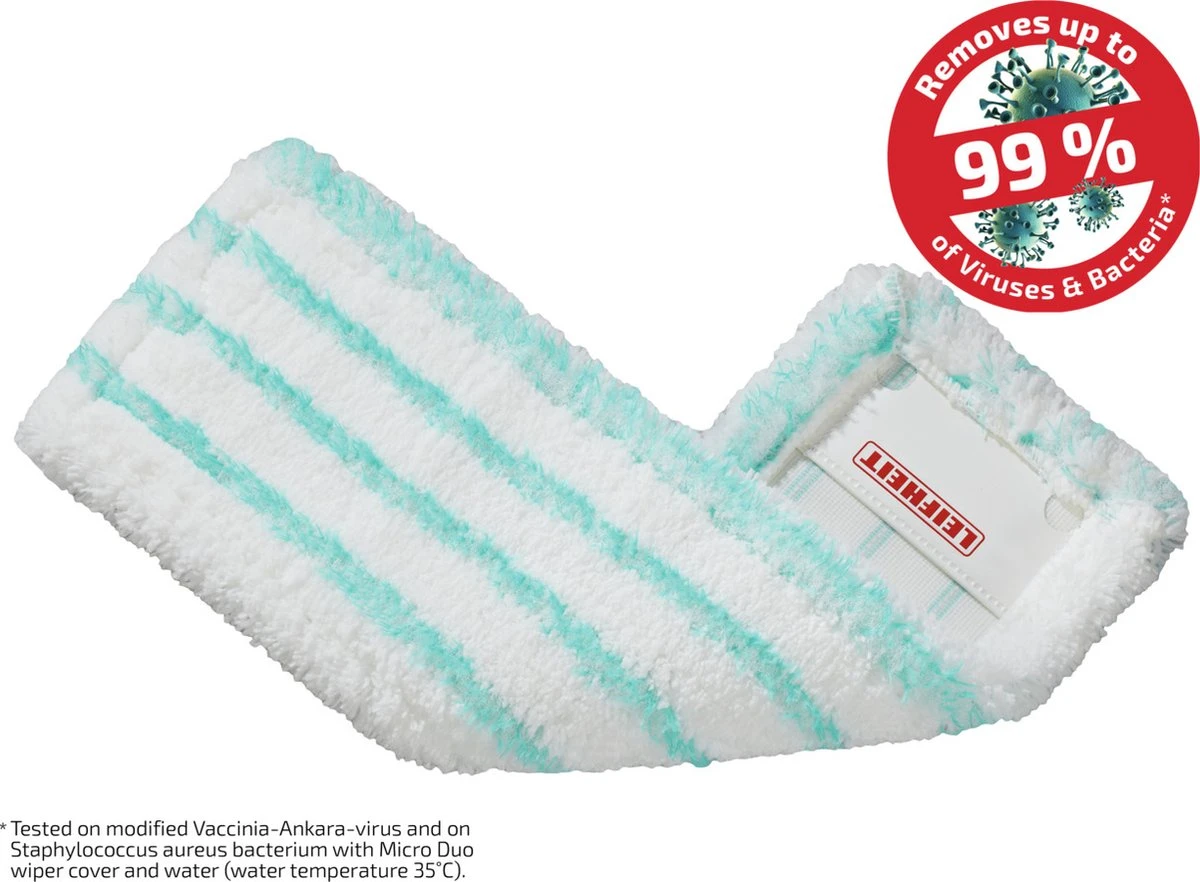 Vanaf nu hebben zelfs vet en het fijnste vuil geen kans meer. De Leifheit-vloerdoek Profi micro duo biedt met zijn microvezels en speciale harde vezels dubbele reinigingskracht. De licht uitstekende harde vezels halen het vuil uit elke voeg, en reiken bij gestructureerde oppervlakken tot in elke verdieping. De microvezels nemen met hun extreem fijne vezels en hun grote oppervlak al het vuil en water op. De vloerdoek Profi micro duo is wasbaar op 60°C en verliest ook na herhaaldelijk wassen zijn reinigingskracht nhiet. Geschikt voor alle gladde vloeren, zoals steen, parket en laminaat. Het bijpassende dweilsysteem is de vloerwisser Profi, die zonder bukken en met een voetklik bediend kan worden.