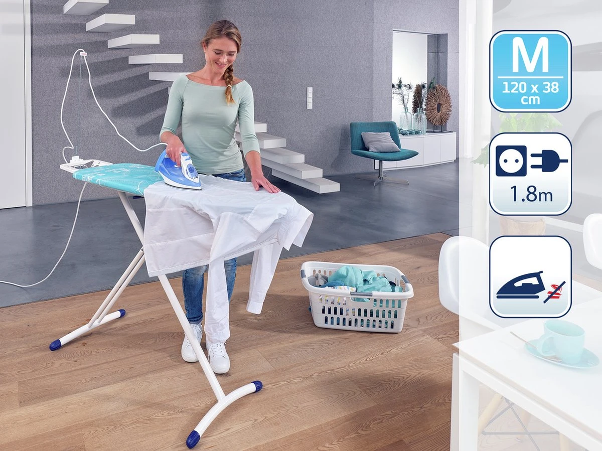 Opzetten en weer opbergen is een fluitje van een cent, want de Air Board M Solid Plus heeft een strijkvlak van ultralicht speciaal kunststof. Het strijkvlak van 120 x 38 cm rust op een robuust en absoluut stabiel onderstel van ronde 35 mm dikke buizen. In hoogte verstelbaar tot 100 cm – voor vrijwel iedere lichaamslengte is de ideale werkhoogte in te stellen. De strijkplank is voorzien van een vaste strijkijzerhouder met stopcontact en snoergeleider. Voor strijken met optimale bewegingsvrijheid zonder dat het snoer in de weg zit.