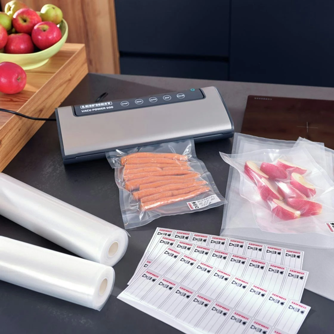 Gevacumeerd voedsel blijft 5x langer vers. De vacumeerzakken van Leifheit zijn kook- en vriesbestendig én geschikt voor in de magnetron. De sealnaad voorkomt knoeien of lekken. De 56 etiketten helpen bij het onthouden van de versheidsdatum.