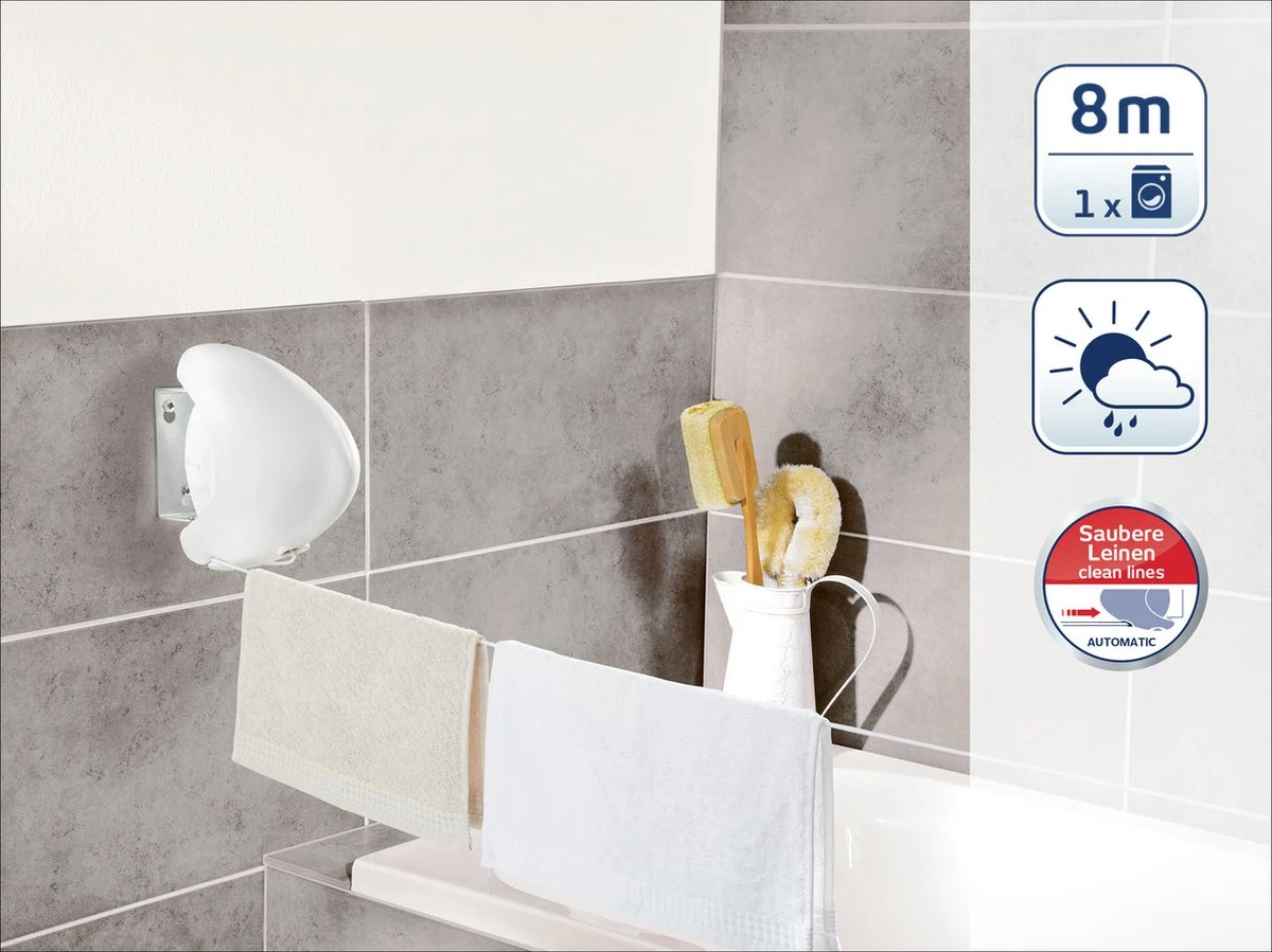 Met 8 meter waslijn heb je plek voor 1 wasmachinelading. Je kunt kiezen hoe lang je de lijn wilt hebben. De lengte is flexibel aan te passen aan de ruimte die je hebt. En net zo praktisch is de draaibare rolautomaat. Zo kun je de richting van de lijn zelf bepalen: recht of schuin. Als de lijn niet in gebruik is, kun je de rolautomaat plaatsbesparend tegen de wand klappen.