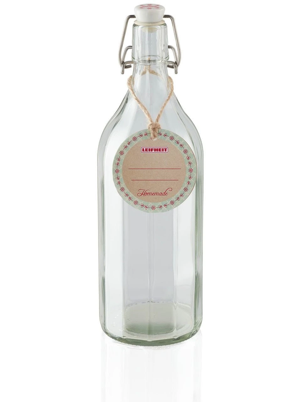 Mooi gevormde, hittebestendige glazen fles met geslepen facetten en draadbeugelsluiting van roestvrij edelstaal. Met een praktische inhoud van 1000 ml, ideaal geschikt voor vers geperste sappen, eigengemaakte siroop, azijn en olie of als inmaakfles. Geschikt voor de afwasmachine. Made in Germany.